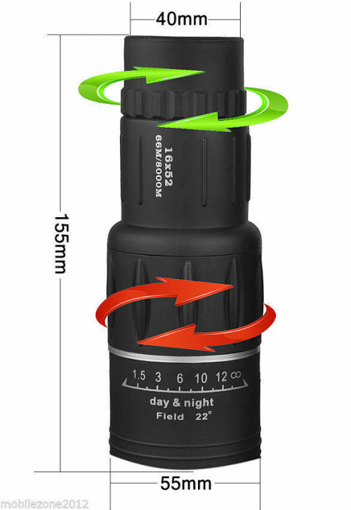 Zoom: 16x52 mm, es decir, aumenta 16 veces con un diámetro del lente objetivo de 52 mm.