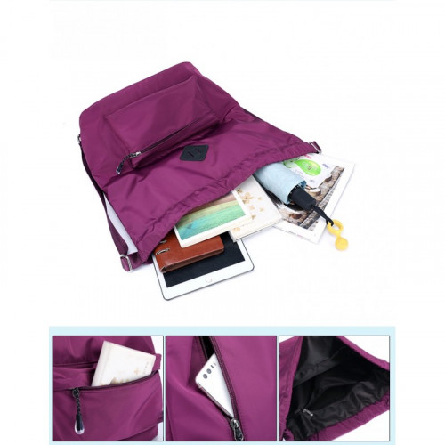 Mochila tipo bolsa, con cierre superior completamente ajustable.