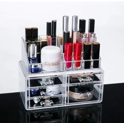Organizador acrílico de cosméticos con 5 cajones y diferentes compartimientos.