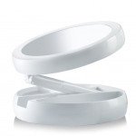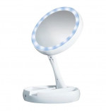 Presentamos un espejo de mesa plegable con luz, con doble cara: por un lado es un espejo normal y por el otro tiene 10 puntos de aumento.