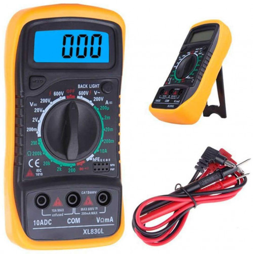 Este multímetro digital es un aparato que permite la medición de tensión contínua y alterna, corriente continua, resistencia, pilas.
