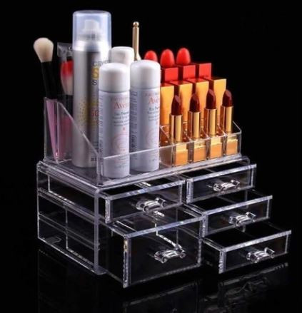 Organizador acrílico de cosméticos con 5 cajones y diferentes compartimientos.